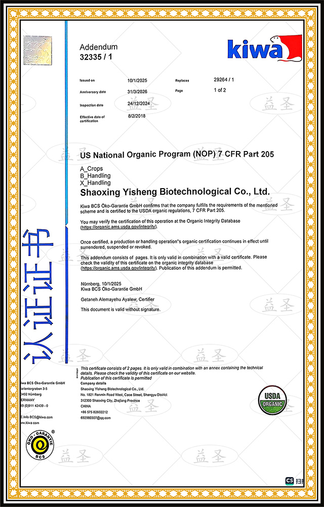 Yisheng Biotechnology, a subsidiary of Wanshida , has obtained the Japanese JAS and USDA organic certificates